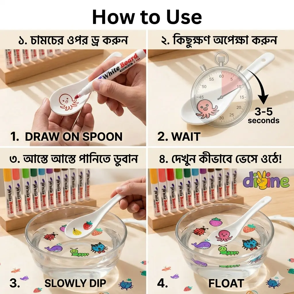 •  জাদুকরী ওয়াটার-ফ্লোটিং ইঙ্ক: এটি কোনো সাধারণ মার্কার নয়! এর বিশেষ কালি দিয়ে সিরামিক চামচে কোনো ছবি এঁকে পানিতে ডুবালেই তা আলতো করে ভেসে ওঠে। এই “ম্যাজিক” বাচ্চাদের ঘণ্টার পর ঘণ্টা ব্যস্ত রাখতে যথেষ্ট।